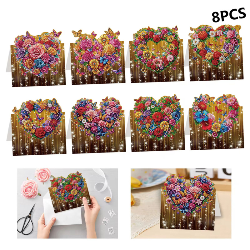 Diamond Painting Kaarten Pakket met 8 Hartjes Rozen kaarten